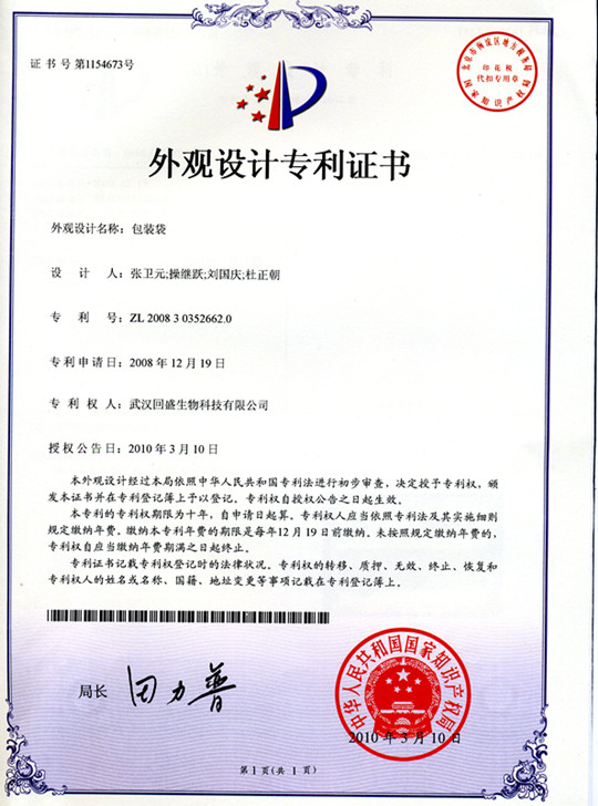 外觀設計專利證書(袋專利)